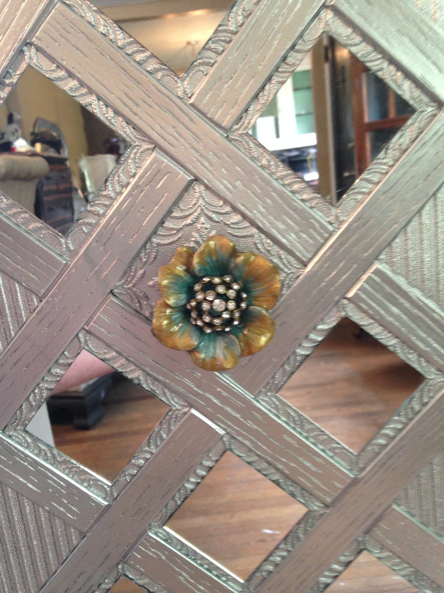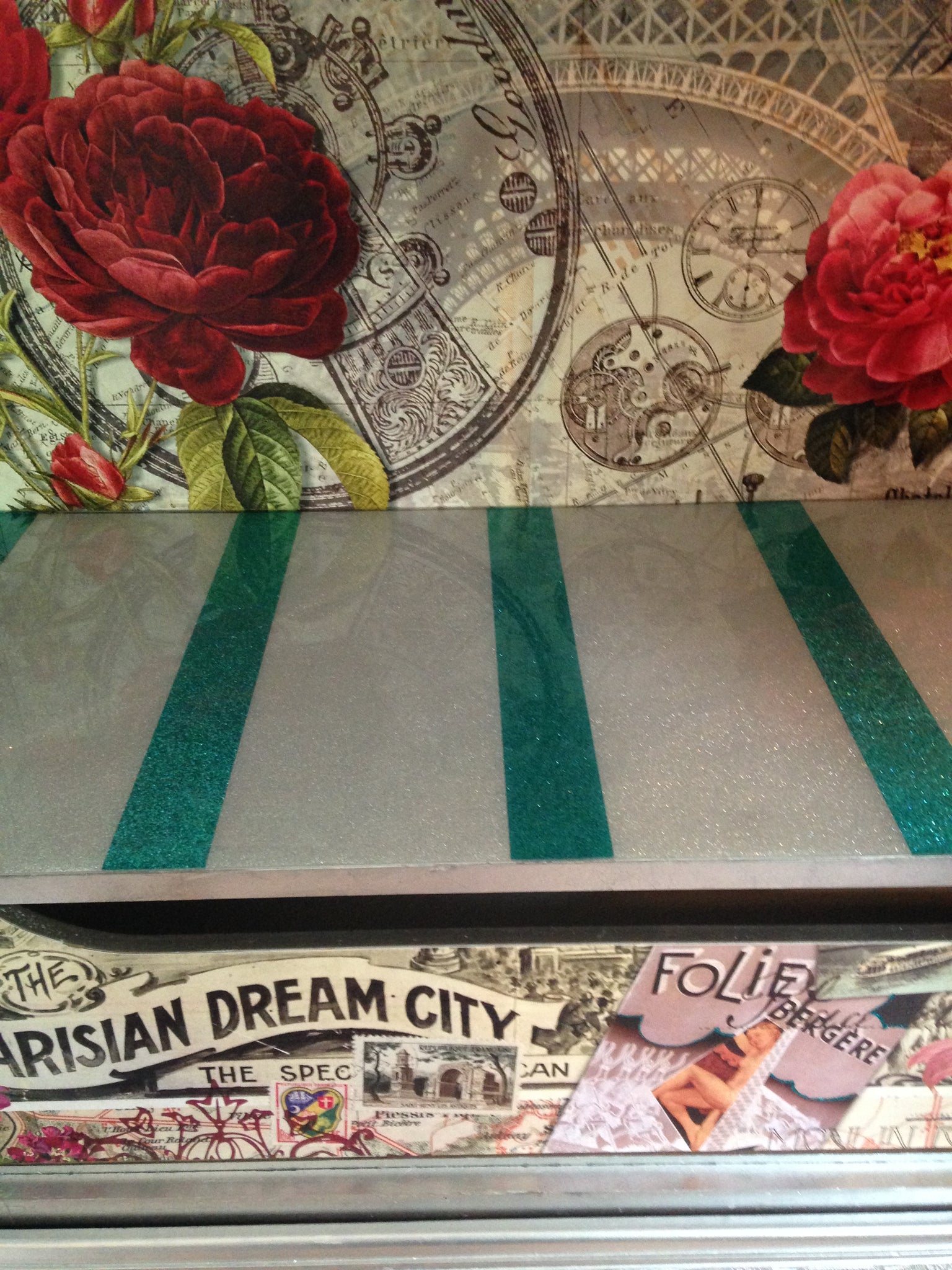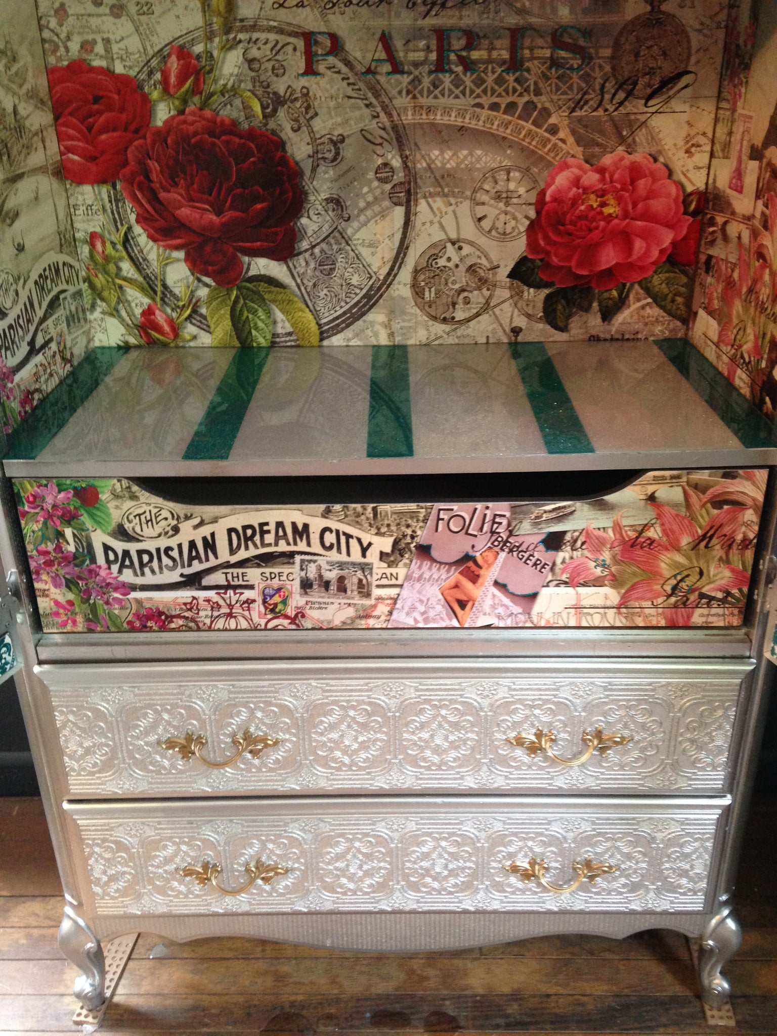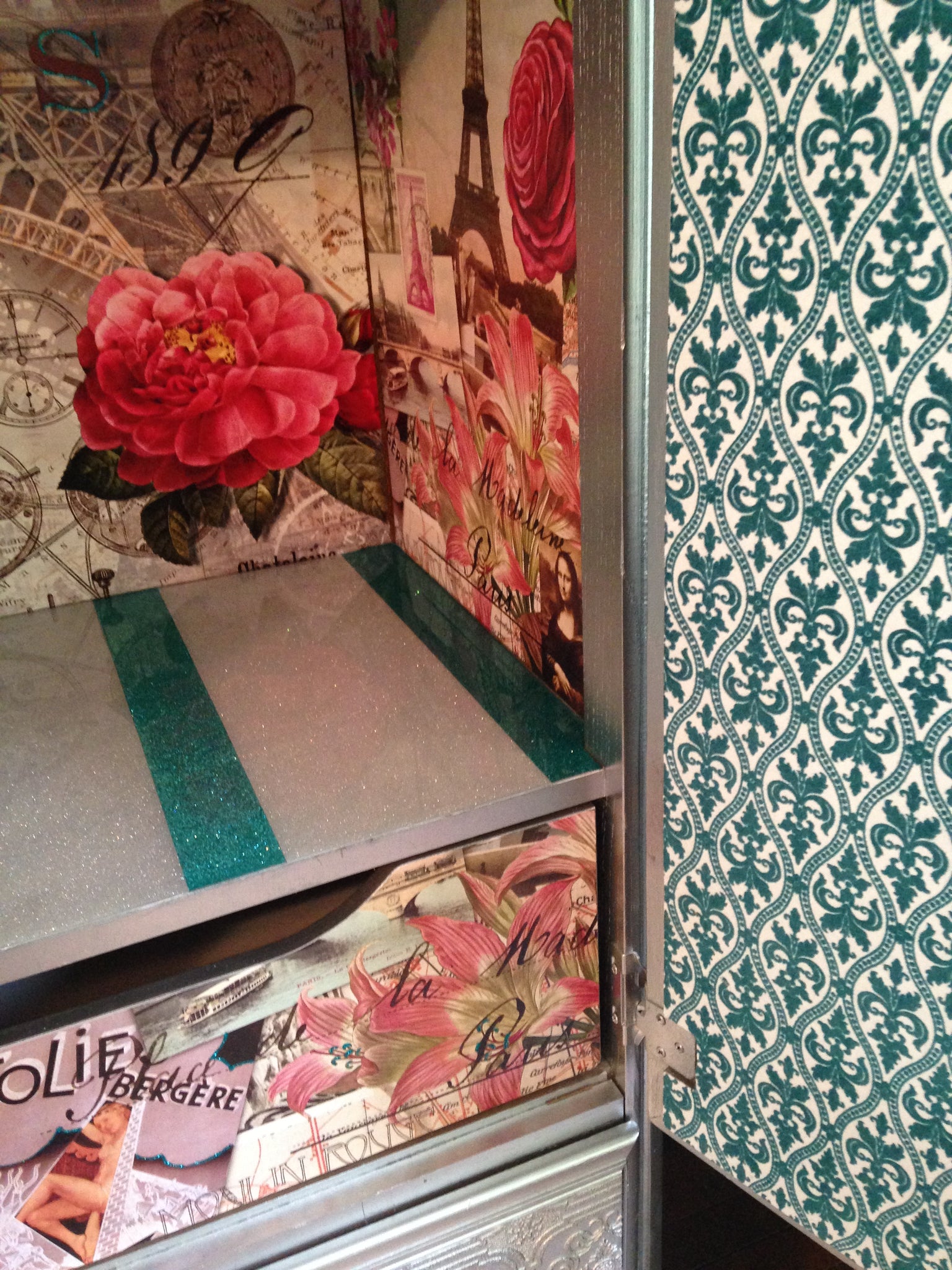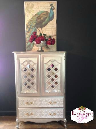 Silver french armoire or liquor cabinet with embossed drawer fronts, mirrored inset exterior doors, and a Paris themed interior including flocked door panels and a glass coat striped shelf - need I say more?!